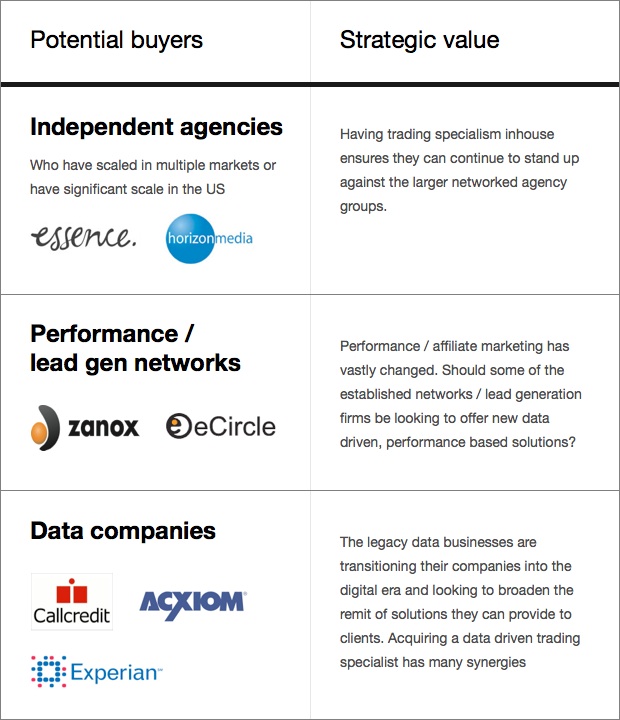 If looking more broadly than simply a business that buys RTB-enabled inventory, there are numerous types of strategic buyers who could, and should, be looking to acquire companies that excel at data-driven advertising, have developed an infrastructure to compute lots of data; understand how to fuse multiple data sets and activate them and have the capability to analyse trends and patterns. This type of business has numerous options open to them, some topline examples are provided in the table below: