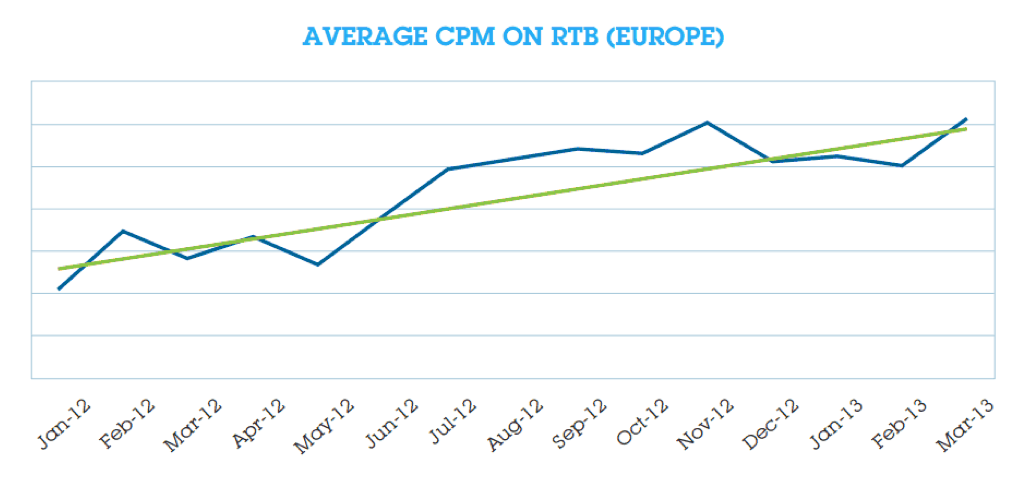 Where CPM rates for programmatically traded inventory had peaked during the 2012 Christmas holiday season, and fell as consumer shopping declined in January, the trend was reversed in February and by March CPMs reached an all-time high.RTB spend in March brought overall spend for the quarter to an all-time high.