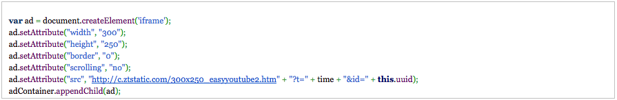 Sambreel’s plugins inject ads by adding iframe elements to the page, hosted on the c.ztstatic.com domain: