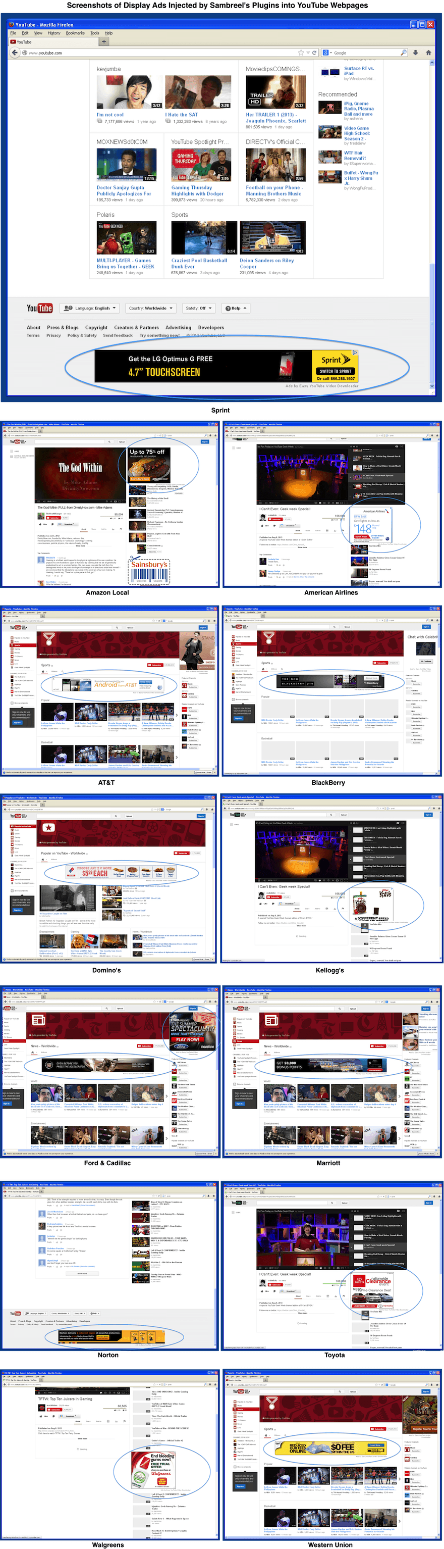 When a user who has installed these plugins visits YouTube, multiple display ad slots are injected across the YouTube homepage, channel pages, video pages and search results pages. These display ad slots are being bought today by premium advertisers like Amazon Local, American Airlines, AT&T, BlackBerry, Cadillac, Domino’s, Ford, Kellogg’s, Marriott, Norton, Toyota, Sprint, Walgreens and Western Union. Screenshots are shown below.