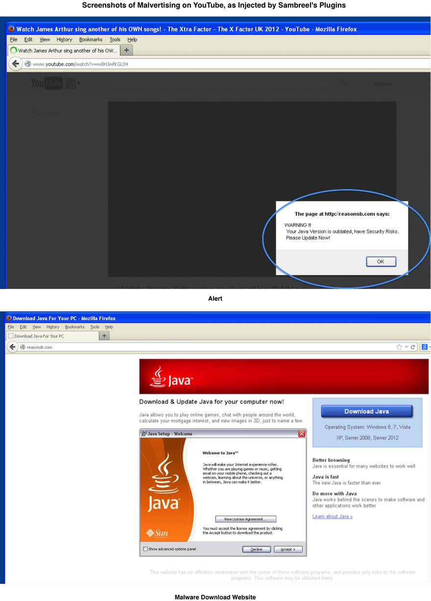 The display ad slots injected by Sambreel are also being bought today by malvertisers—advertisers who provide malicious or malware-laden advertisements with a view to spreading malware to new users. Example screenshots are included below. The first screenshot shows a fake alert, which suggests to the user that a Java update is required. If the user clicks the OK button, then the user is taken to the disreputable site shown in the second screenshot.
