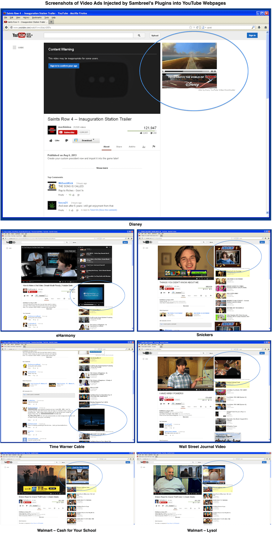 Unfortunately, this rather unscrupulous form of arbitrage has meant that the ad slots injected by Sambreel adware into YouTube are now being sold to video advertisers. We measured the extent to which these Sambreel ad slots are being bought by video advertisers by analysing close to a billion video ad slots sold through non-Google video ad exchanges. We identified over 3.5 million installations of Sambreel’s YouTube-focused adware plugins. Just over 15% of the analysed video ad slots were Sambreel ad slots injected into YouTube. Example screenshots are shown below.