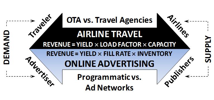 The airline travel industry was revolutionised by online travel agencies (OTAs) 15 years ago (e.g., Priceline, Orbitz, Opodo) – today, the parallels with programmatic trading and its impact on online advertising are striking. OTAs enabled real-time access to fare and inventory availability across airlines, and reduced the role of travel agencies as a middleman. Today, programmatic trading via real-time bidding (RTB) stands to displace advertising agencies in all but direct sales, with efficient real-time access to inventory, at scale, and aligned with advertiser needs.